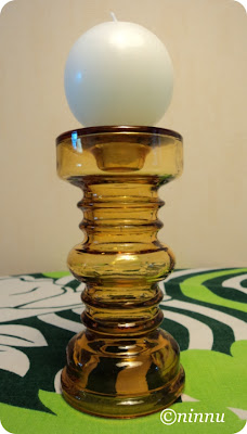 Aika erikoinen neliömuoto kynttilänjalalle, mutta kyllähän pallokynttilä ihan kivasti tuohon sopii. Painava esine. Seinämissä kiertää S-kohokuvio.